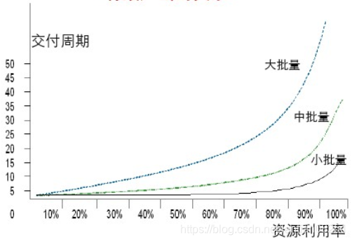 逐步提炼需求的现实意味着软件开发应该以小批量、频繁交付的节奏进行,这是敏捷开发的一条基本原则,也是软件开发的客观规律。在需求响应周期相同的情况下,一次开发的需求量越小,开发资源利用率就越高;在资源利用率相同的情况下,批量越小,其交付周期就越短(见下图)。