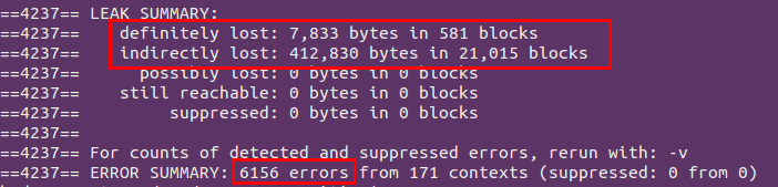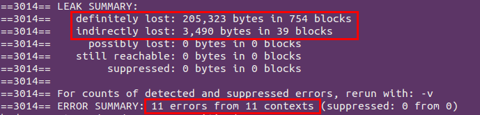 ==3093== Memcheck, a memory error detector ==3093== Copyright (C) 2002-2012, and GNU GPL'd, by Julian Seward et al. ==3093== Using Valgrind-3.8.1 and LibVEX; rerun with -h for copyright info ==3093== Command: ./test ==3093== delete accept_pair. delete accept_pair. delete accept_pair. app_name: Alexia size: 5 delete dfa. delete accept_pair. delete dfa. delete accept_pair. delete dfa. delete accept_pair. delete dfa. delete accept_pair. delete dfa. delete accept_pair. ==3093== ==3093== HEAP SUMMARY: ==3093== in use at exit: 16 bytes in 2 blocks ==3093== total heap usage: 21 allocs, 19 frees, 176 bytes allocated ==3093== ==3093== 16 bytes in 2 blocks are definitely lost in loss record 1 of 1 ==3093== at 0x402BE94: operator new(unsigned int) (in /usr/lib/valgrind/vgpreload_memcheck-x86-linux.so) ==3093== by 0x8048A71: DFA::add_size(int) (in /home/hadoop/test/test) ==3093== by 0x8048798: main (in /home/hadoop/test/test) ==3093== ==3093== LEAK SUMMARY: ==3093== definitely lost: 16 bytes in 2 blocks ==3093== indirectly lost: 0 bytes in 0 blocks ==3093== possibly lost: 0 bytes in 0 blocks ==3093== still reachable: 0 bytes in 0 blocks ==3093== suppressed: 0 bytes in 0 blocks ==3093== ==3093== For counts of detected and suppressed errors, rerun with: -v ==3093== ERROR SUMMARY: 1 errors from 1 contexts (suppressed: 0 from 0)