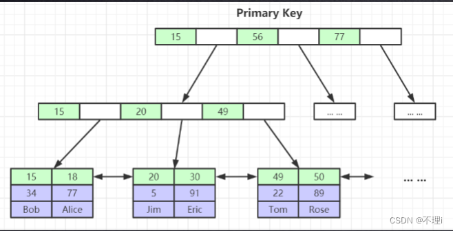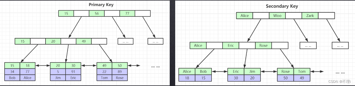 注:B+树数据全部放在叶子节点上,致使相同数据量想B+树比B树高度低;