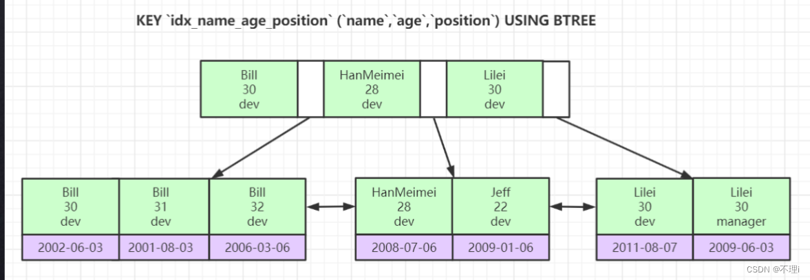 因为若越过最左列开始匹配,就会发现数据开始无序。以上图为例:若条件age>30,发现叶节点(Bill、31、dev)满足条件,于是向右查找,发现叶节点(HanMeimei,28,dev)小于30,故索引失效(B+树叶节点从左至右升序排列)。