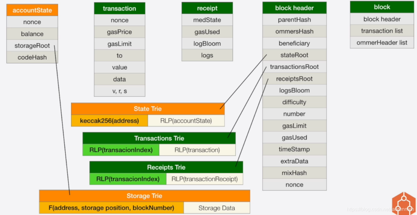 区块头 BlockHeader: parentHash ommersHash benefitiary stateRoot transactionRoot receiptRoot logBloom difficulty number gasLimit gasUsed timeStamp extraData mixHash nonce