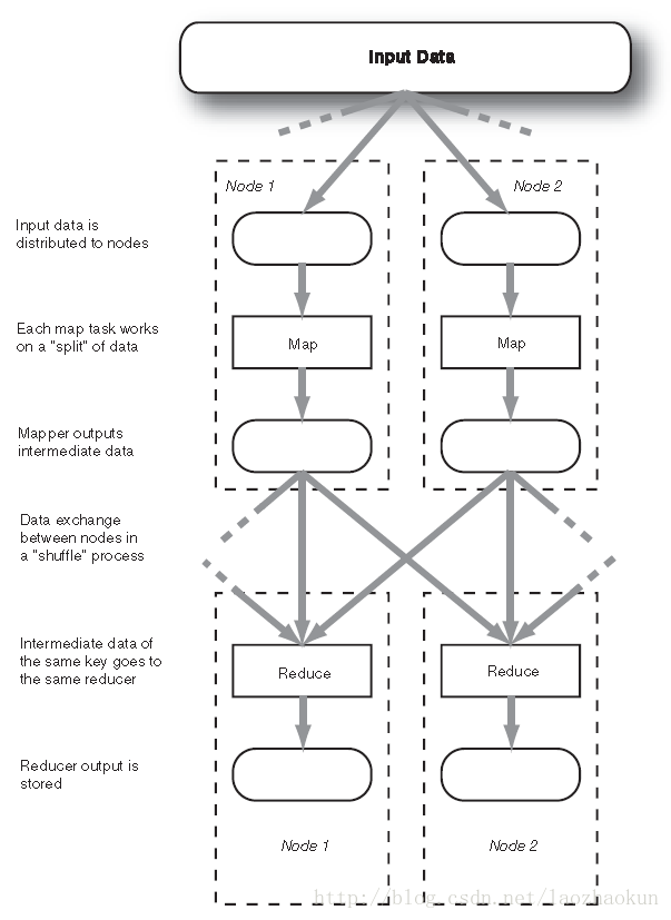 普通的MapReduce数据流。输入数据被分配到不同节点之后,节点间通信的唯一时间是在“洗牌”阶段,这个通信约束对可扩展性有极大帮助。