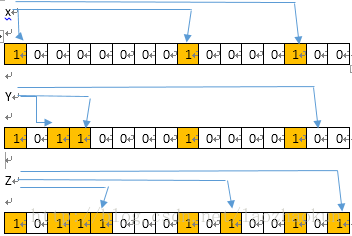 ,不知道什么工具比较好?)是使用三个散列函数的Bloom Filter中添加了几个对象(x,y,z)的过程。无论以前的状态是什么,比特位都被设置为1,在位数组中的1的个数只能增加。对象(如x,y,z)被确定地散列到数组中的位上,而这些位被设置为1,通过散列并检查那些位置上的比特值,可以查看一个对象是否在这个集合中。