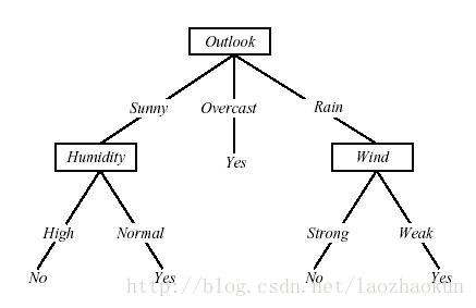 表示法:把实例从根节点排列到某个叶子节点来分类实例,叶子节点即为实例所属的分类。树上的每一个节点指定了对实例的某个属性(attribute)的测试,并且该节点的每一个后缀分支对应于该属性的一个可能值。分类实例的方法是从这棵树的根节点开始,测试这个节点指定的属性,然后按照给定实例的该属性值对应的树枝向下移动。然后这个过程在以新节点为根的子树上重复。