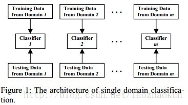Shoushan Liand Chengqing Zong的这篇文章[2]同样是对多领域数据的分类研究,他们提出的方法是把特征层面和分类器层面进行融合。此文首先是批判了上图所描述的独立分类的不足,然后提出了自己的新的方法,即在分类的同时进行分类器间的融合,具体步骤如下图: