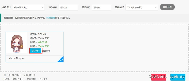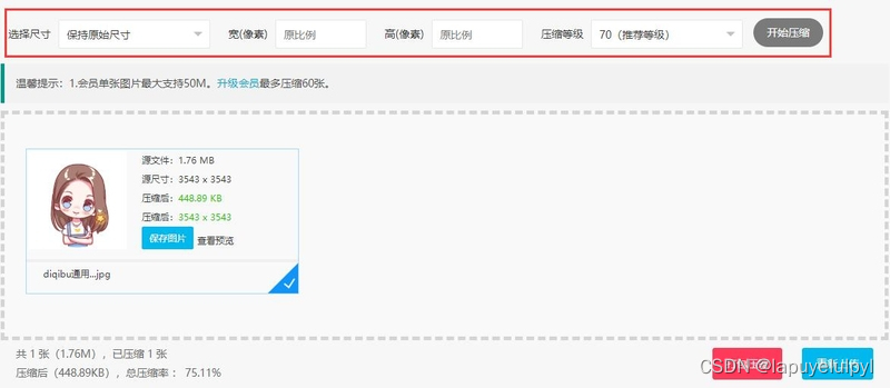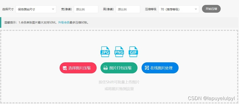 2.点击选择图片压缩,找到需要压缩的照片,然后选择需要的尺寸、宽、高、压缩等级等参数(压缩等级默认70)。如果压缩的图片大小未能满足您的要求,可重新选择压缩等级,然后点击开始压缩,即可对图片再次进行处理。