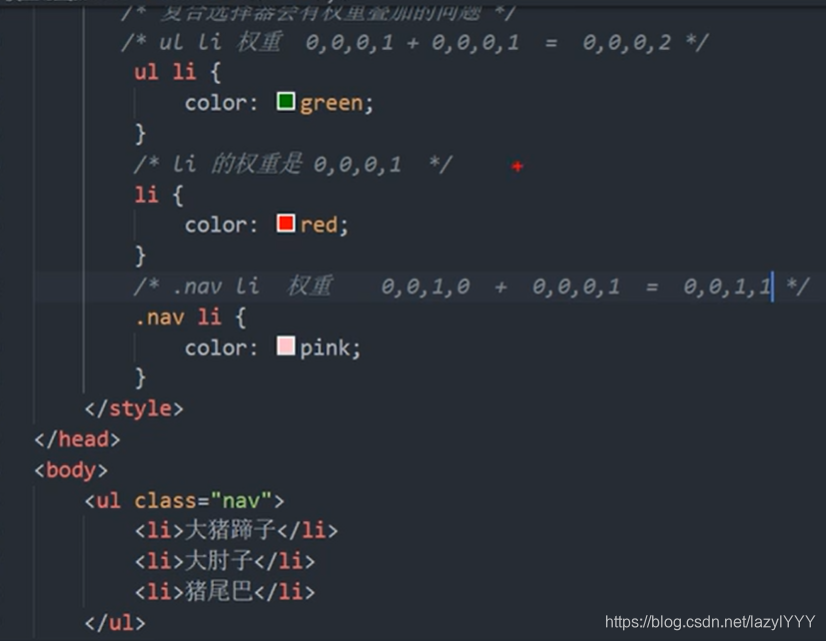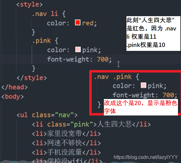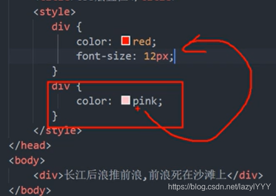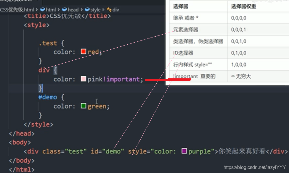 目录 一.层叠(哪个离body近用哪个) 二.继承 三.优先级 四.权重叠加 一.层叠(哪个离body近用哪个) 两个color所以用下面的,但是font-size样式不冲突,不层叠,所以还是12px 二.继承 三.优先级 四.权重叠加 此刻文字应该是什么颜色? 应该是粉色!!! (权重会叠加,但是不会进位)