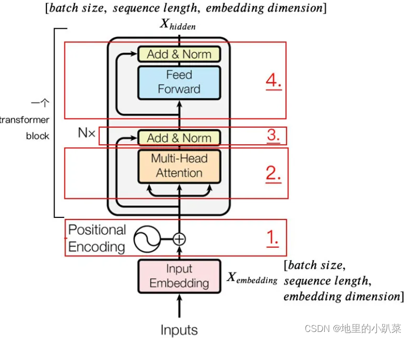 Transformer是谷歌大脑2017年在论文attention is all you need中提出来的seq2seq模型,它的本质就是由编码器和解码器组成,今天的主角则是其中的编码器(在BERT预训练模型中也只用到了编码器部分)如下图所示,这个模块的输入为 𝑋 (每一行代表一个句子,batchsize有多大就有多少行),我们将从输入到隐藏层按照从1到4的顺序逐层来看一下各个维度的变化。