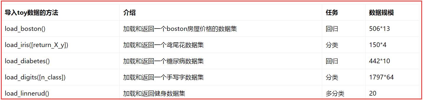 sklearn包含一些不许要下载的toy数据集,见下表,包括波士顿房屋数据集、鸢尾花数据集、糖尿病数据集、手写字数据集和健身数据集等。