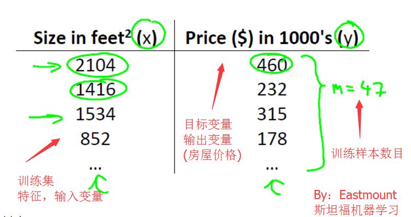 假设:我们要预测房价。当前自变量(输入特征)是房子面积x,因变量是房价y.给定了一批训练集数据。