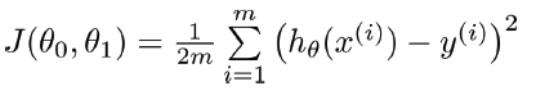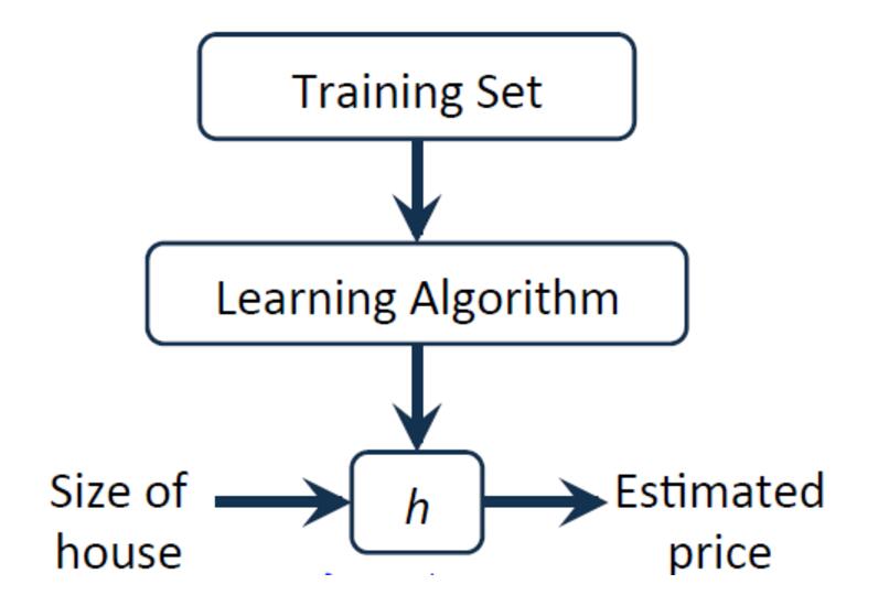 其中x代表房屋的大小,y代表预测的价格,h(hypothesis)将输入变量映射到输出变量y中,如何表示h呢?