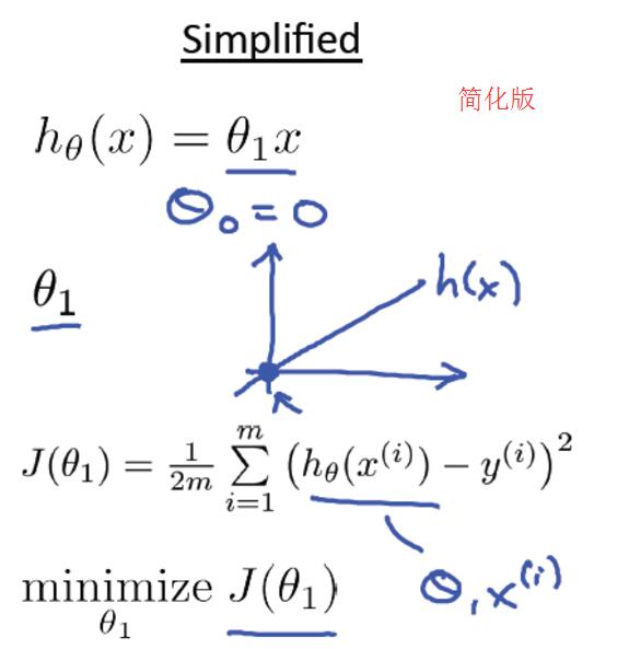 总的来说,线性回归主要包括一下四个部分,分别是Hypothesis、Parameters、Cost Function、Goal。右图位简化版,theta0赋值为0。