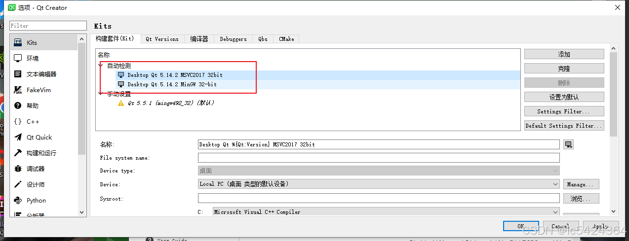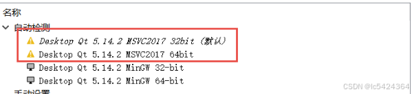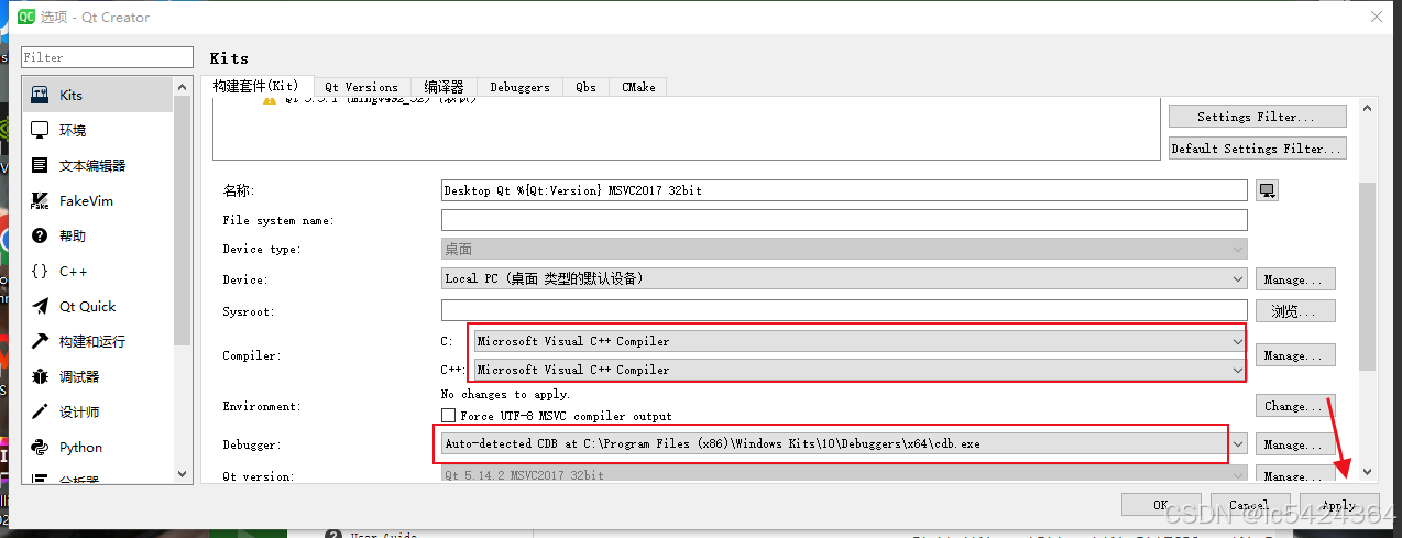 注意:对于64位或者32位编译环境,需要分别设置C或者C++编译器,然后在“构建套件”选择时对应选择即可。按照上面的设置,MSVC2017 64bit 前面的黄色感叹号以消失,说明构建工具的环节设置是有效的,后面就可以使用MSVC2017 64bit的编译环境进行编译程序了