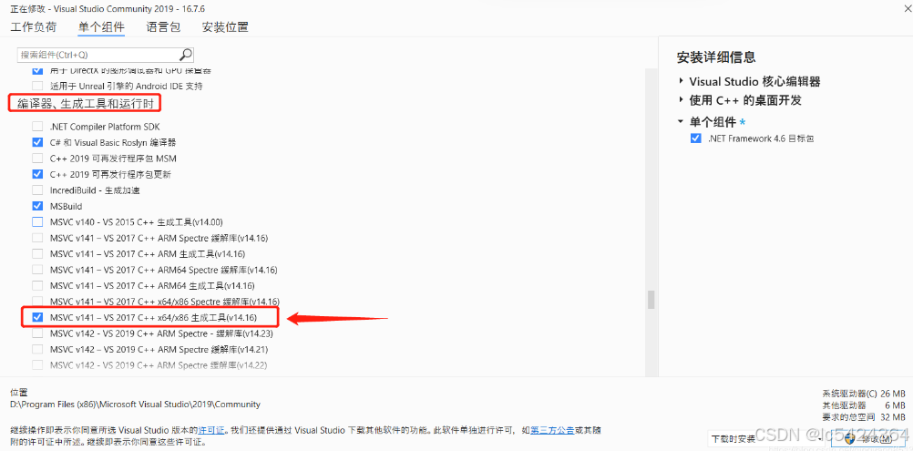 只需要启动Visual Studio Installer,点击“修改”,选择并勾选“单个组件”,找到“MSVC v141 - VS 2017 C++ x64/x86 生成工具(v14.16)”,然后点击“修改”,等待下载并完成安装即可