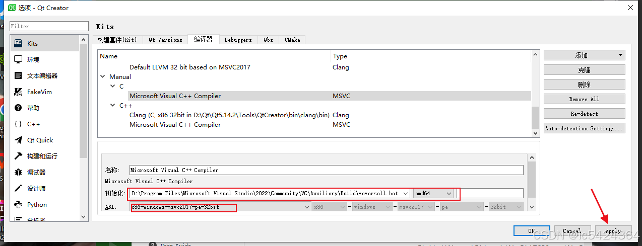 打开“Qt Creator”,选择菜单 “工具” --> “选项” --> “Kits” --> “编译器” --> “添加” --> “MSVC”,分别设置C/C++编译器环境,参考如下: