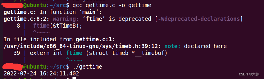 编译会有警告,ftime函数不推荐使用,不过并不影响编译和运行: