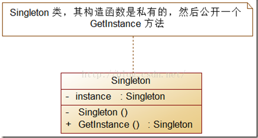 Singleton类,定义一个GetInstance操作,允许客户访问它的唯一实例,GetInstance是一个静态方法,主要负责创建自己的唯一实例。