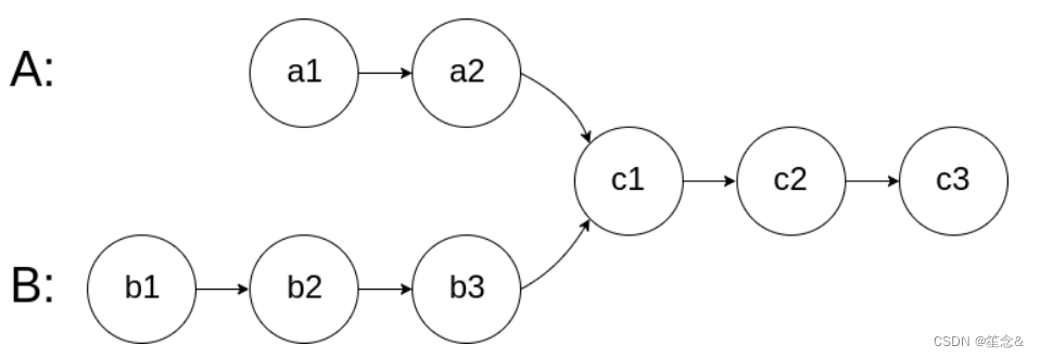 图示两个链表在节点 c1 开始相交: