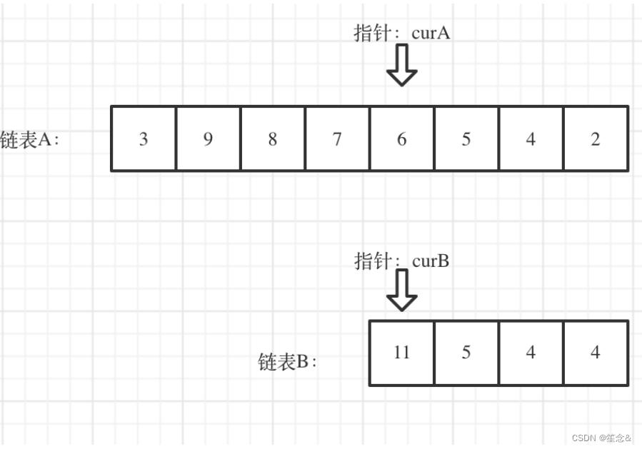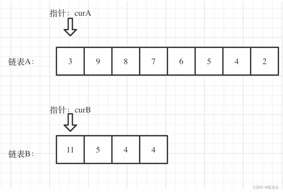 看如下两个链表,目前curA指向链表A的头结点,curB指向链表B的头结点: