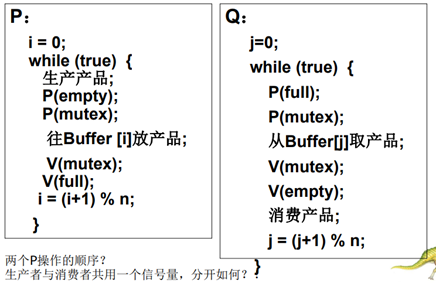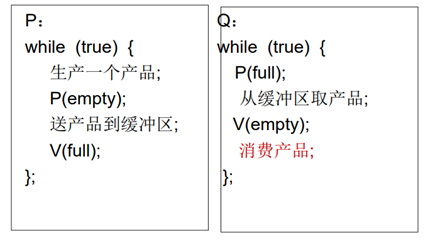P进程不能往“满”的缓冲区中放产品,设置信号 量 empty,初值为 1; Q进程不能从“空”的缓冲区中取产品,设置信号量 full,初值为 0