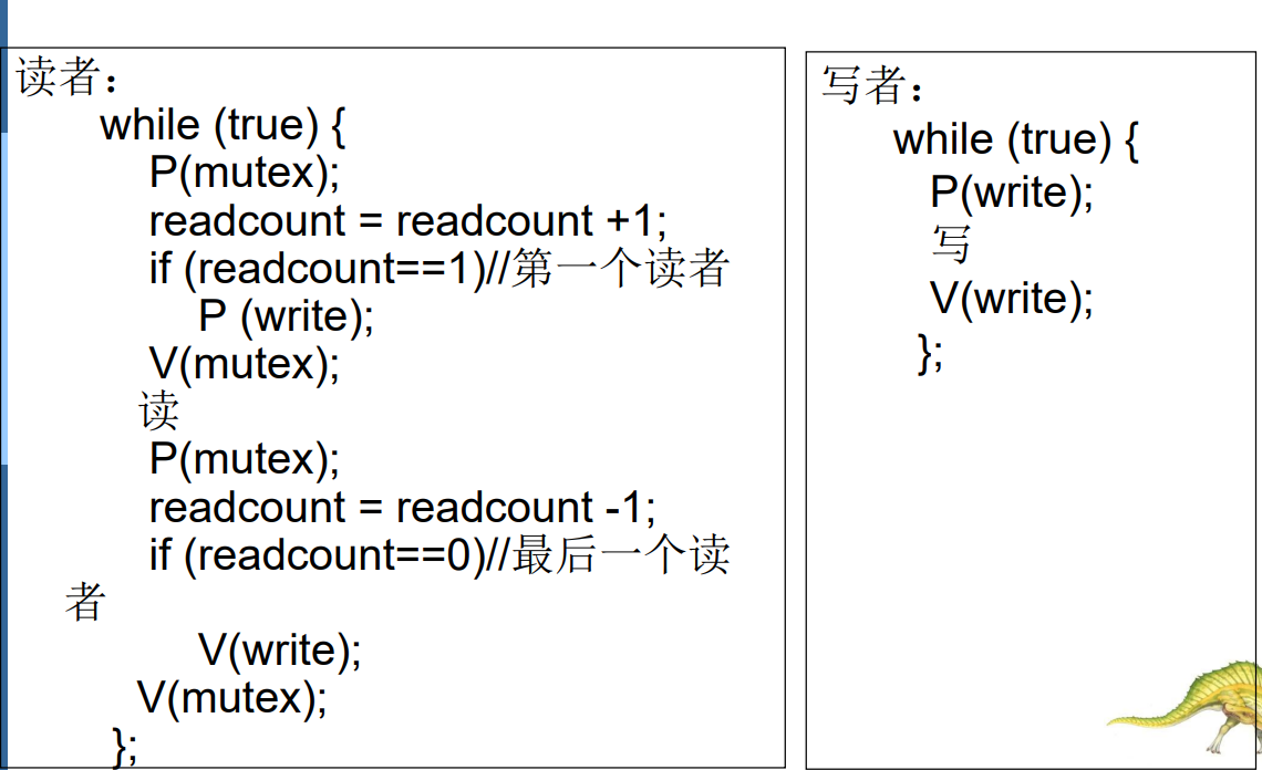 如果写者进程先进,第一个读者会等待在write信号量上,第二个及以后的读者会等待在mutex上,因为mutex计数器未释放。