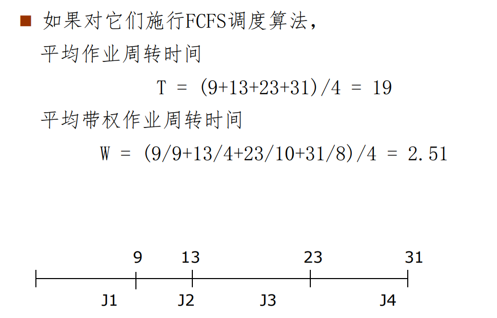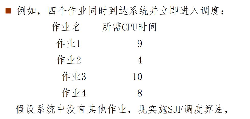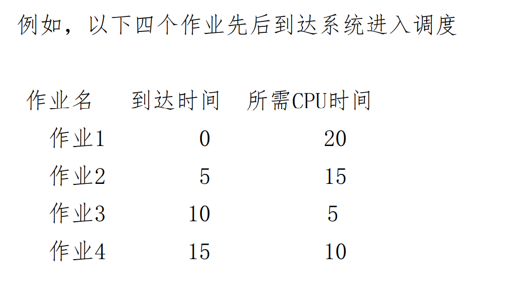 按照作业进入系统的先后次序来挑选作业,先进 入系统的作业优先被挑选。 算法容易实现,效率不高,只顾及作业等候时间 ,没考虑作业要求服务时间的长短