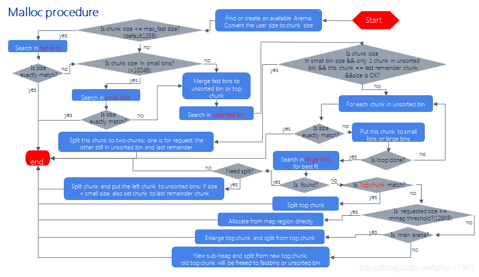 large bins:Small bins后面的bin(64-126)。large bins中的每一个bin分别包含了一个给定范围内的chunk,其中的chunk按大小序排列。按“smallest-first,best-fit”原则在空闲large bins中查找合适的chunk。