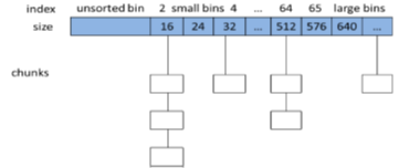 small bins:数组第2-63的前62个bin,同一个small bin中的chunk具有相同的大小。两个相邻的small bin中的chunk大小相差8bytes(x86_64 is 16 bytes.), size < 1024 B。