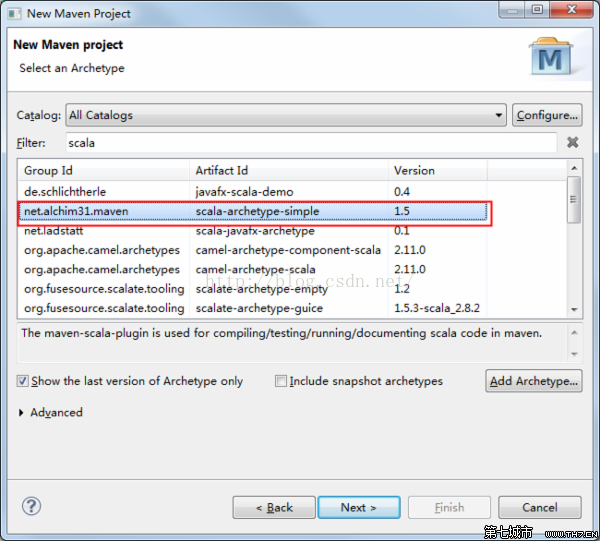 新建Archetype,因为maven默认没有Group Id: net.alchim31.maven Artifact Id: scala-archetype-simple Version:1.5