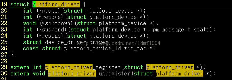 在该部分中,主要相关的是对platform_driver结构体的使用,该结构体在:include/linux/platform_device.h,结构体定义如下:
