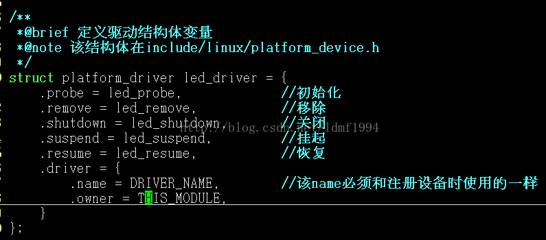 调用platform_driver_register(&led_driver)注册驱动,该函数在led_init()中调用,platform_driver_unregister(&led_driver)在led_exit()中调用。