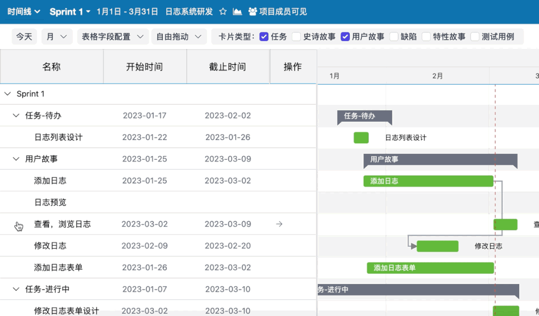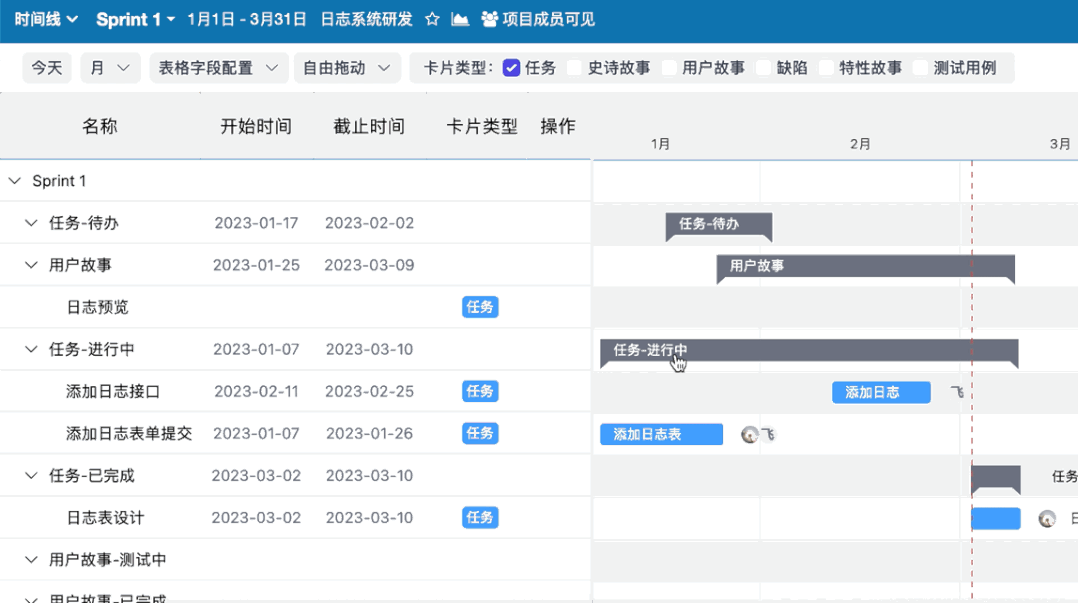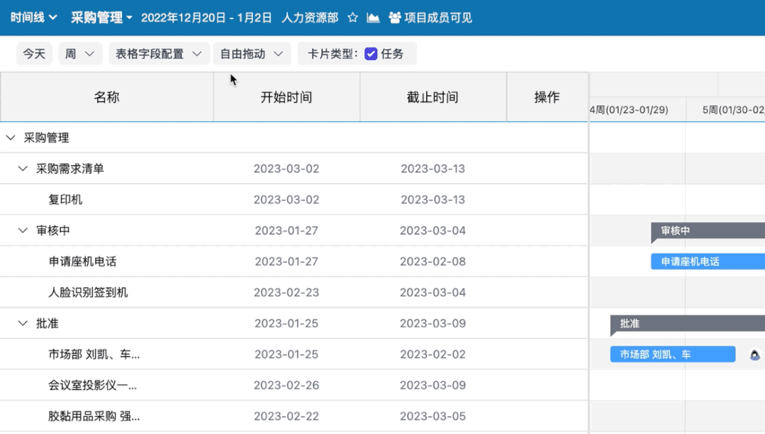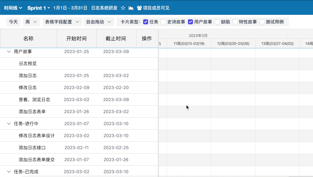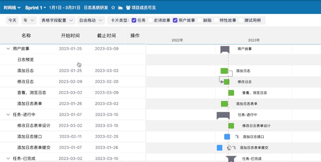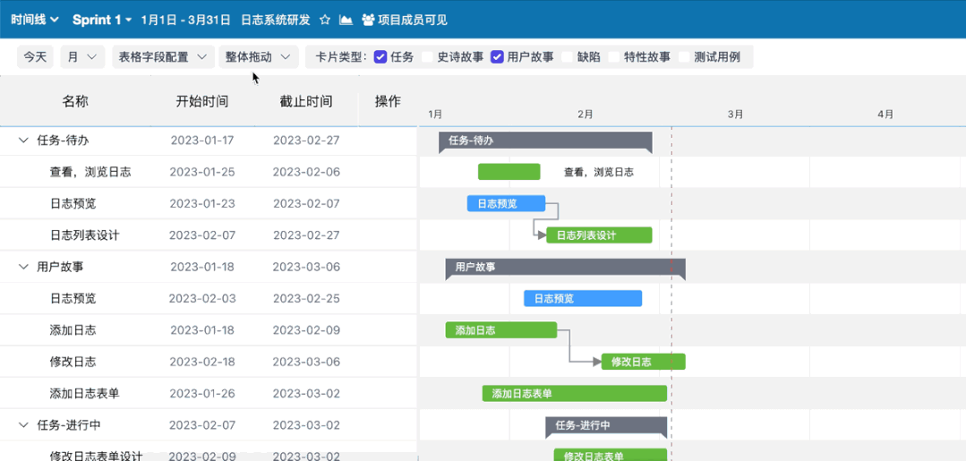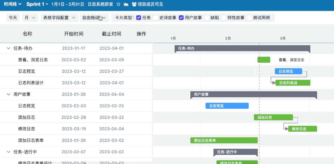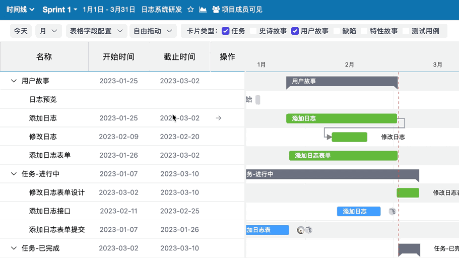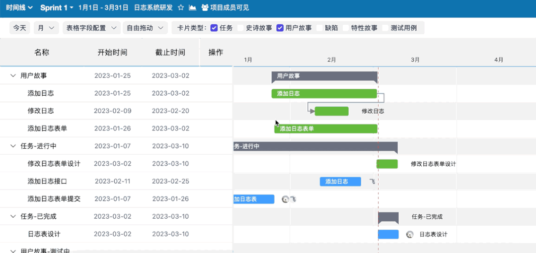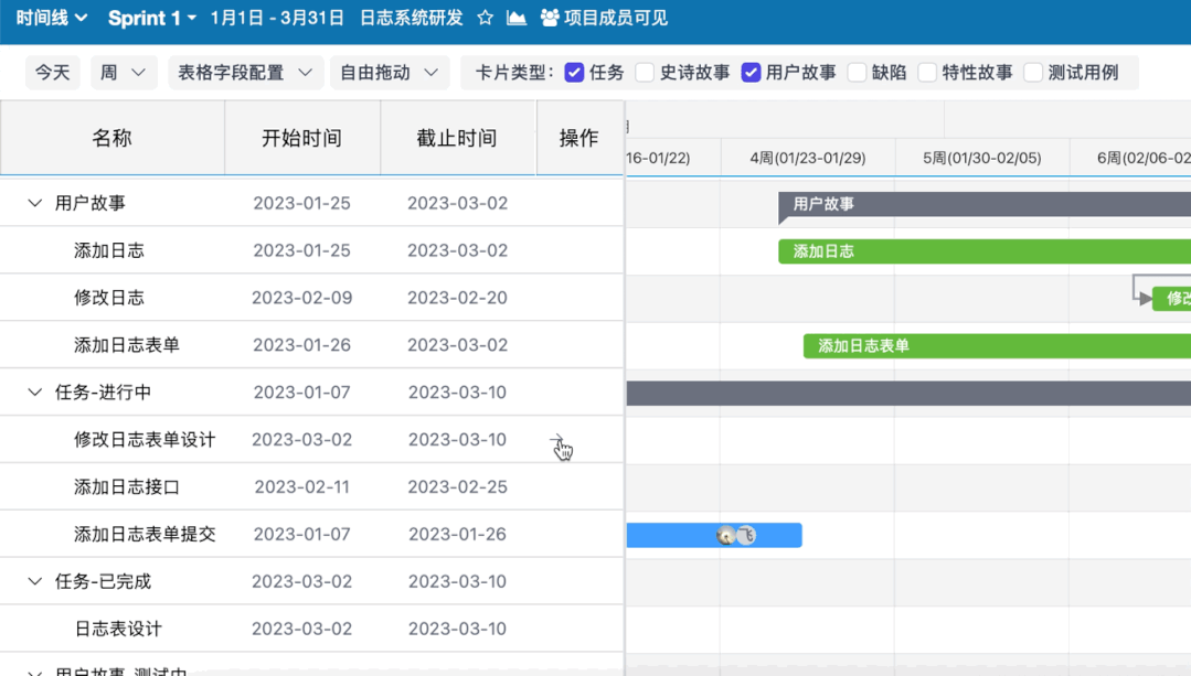 如果任务已设置好开始、截止时间,可以通过拖动时间线区域的时间条来调整任务开始、截止时间。