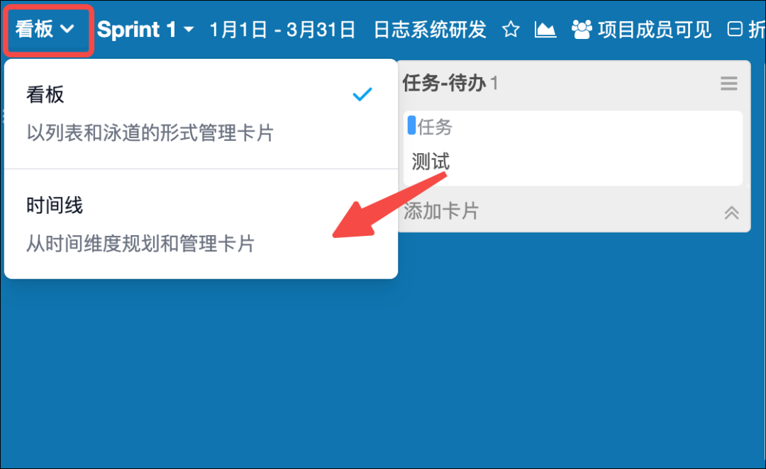 点击看板内最左侧的「看板」下拉框,选择「时间线」进行切换。