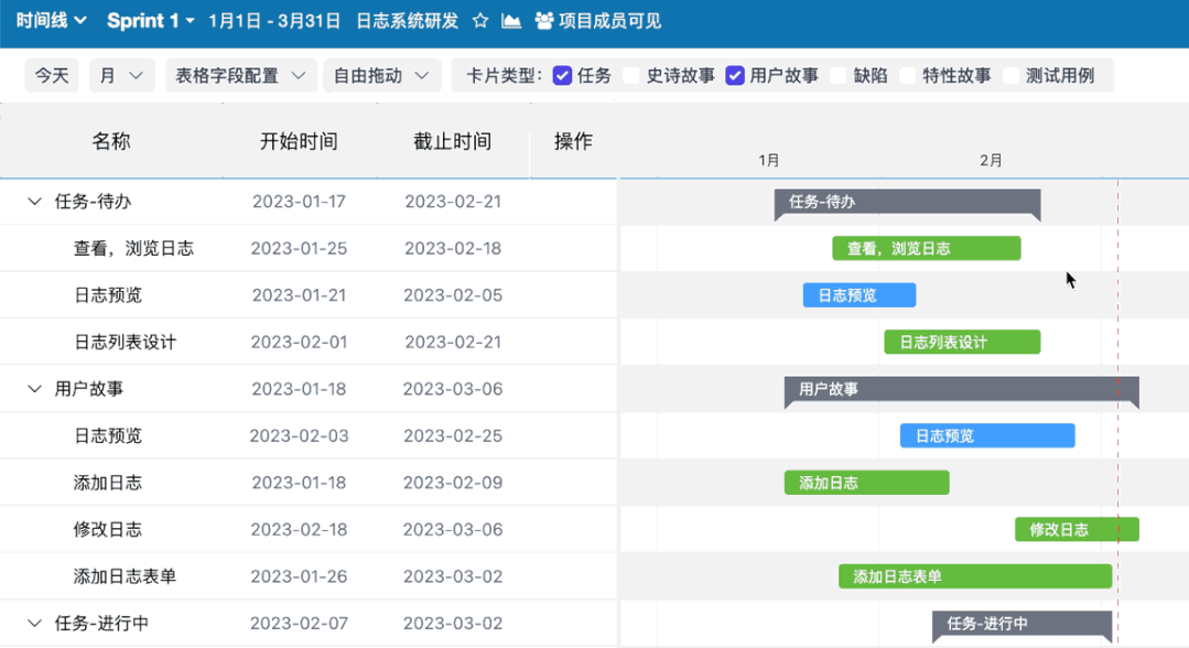 2、卡片类型筛选区会默认勾选此看板的默认卡片类型,通过勾选卡片类型,可自由选择展示在时间线视图中的任务,帮助你更清晰的识别不同类型的任务。
