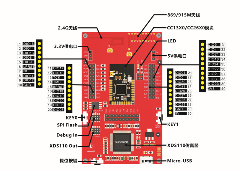 如上图,CC13X0/CC26X0 Evaluation Board开发板引出了模块所有的I/O, USB供电(可独立模块供电)。输出调试接口方便调试其他目标板, 3个物理按键,2个LED以及一个2.4G RF天线和一个Sub-1G RF天线供开发者使用,SPI Flash用以数据存储和OffChip OAD升级。