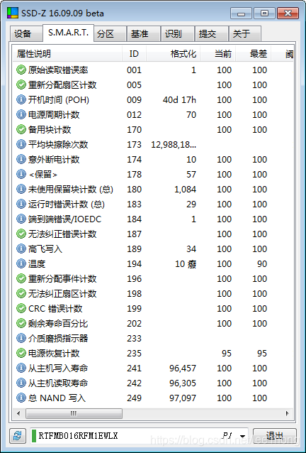 2022年10月11日,累计通电184天15小时,累计写入427258GB,已擦写28869次,S.M.A.R.T.表如下图所示: