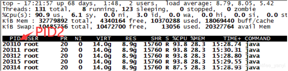 2、top -H -p PID1 根据第一步的PID1查到具体进程PID2