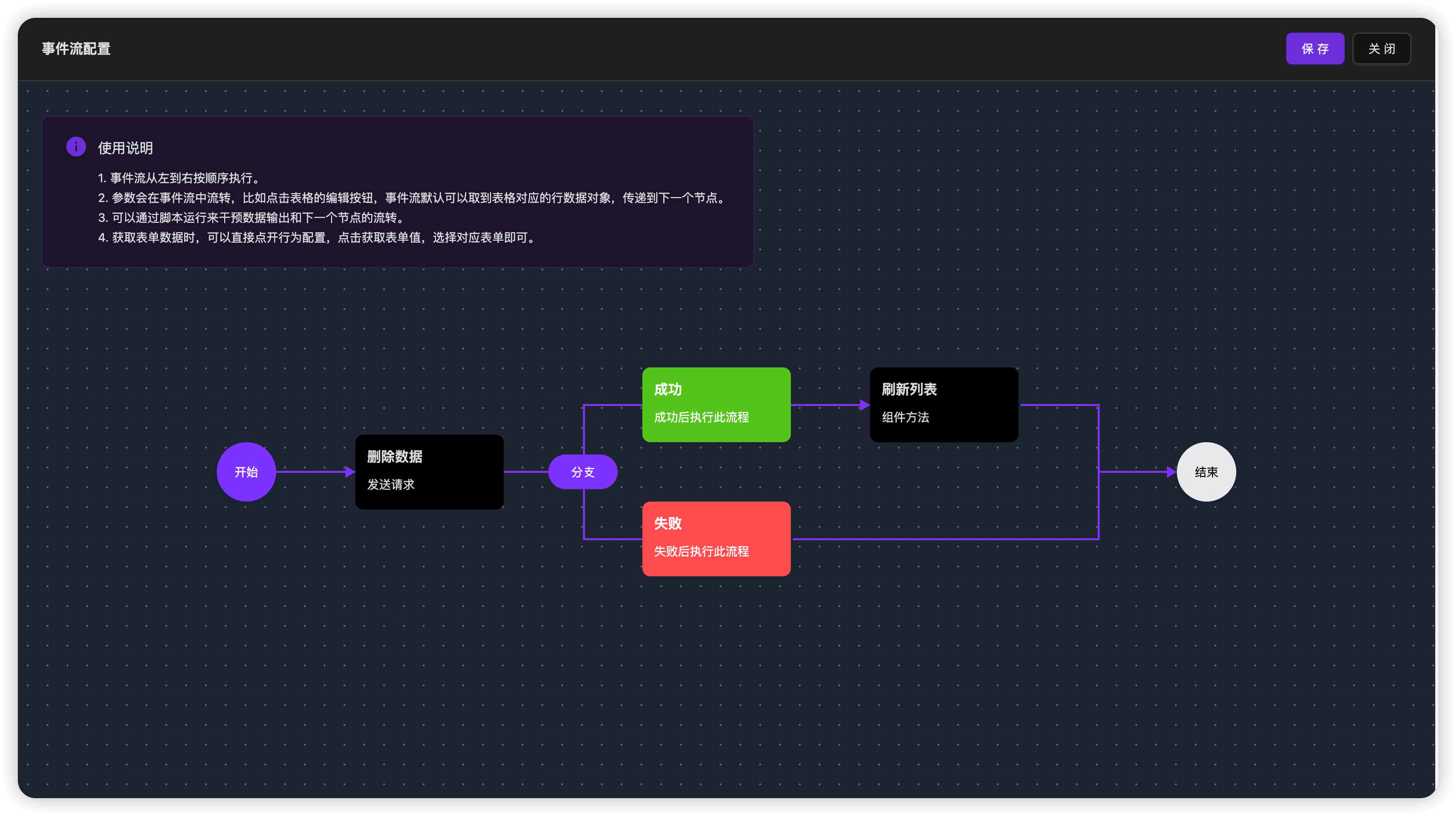 | 事件流配置 | 可视化配置 “组件联动、组件显隐、组件禁用、自定义逻辑、接口调用、路由跳转” 等流程。 |