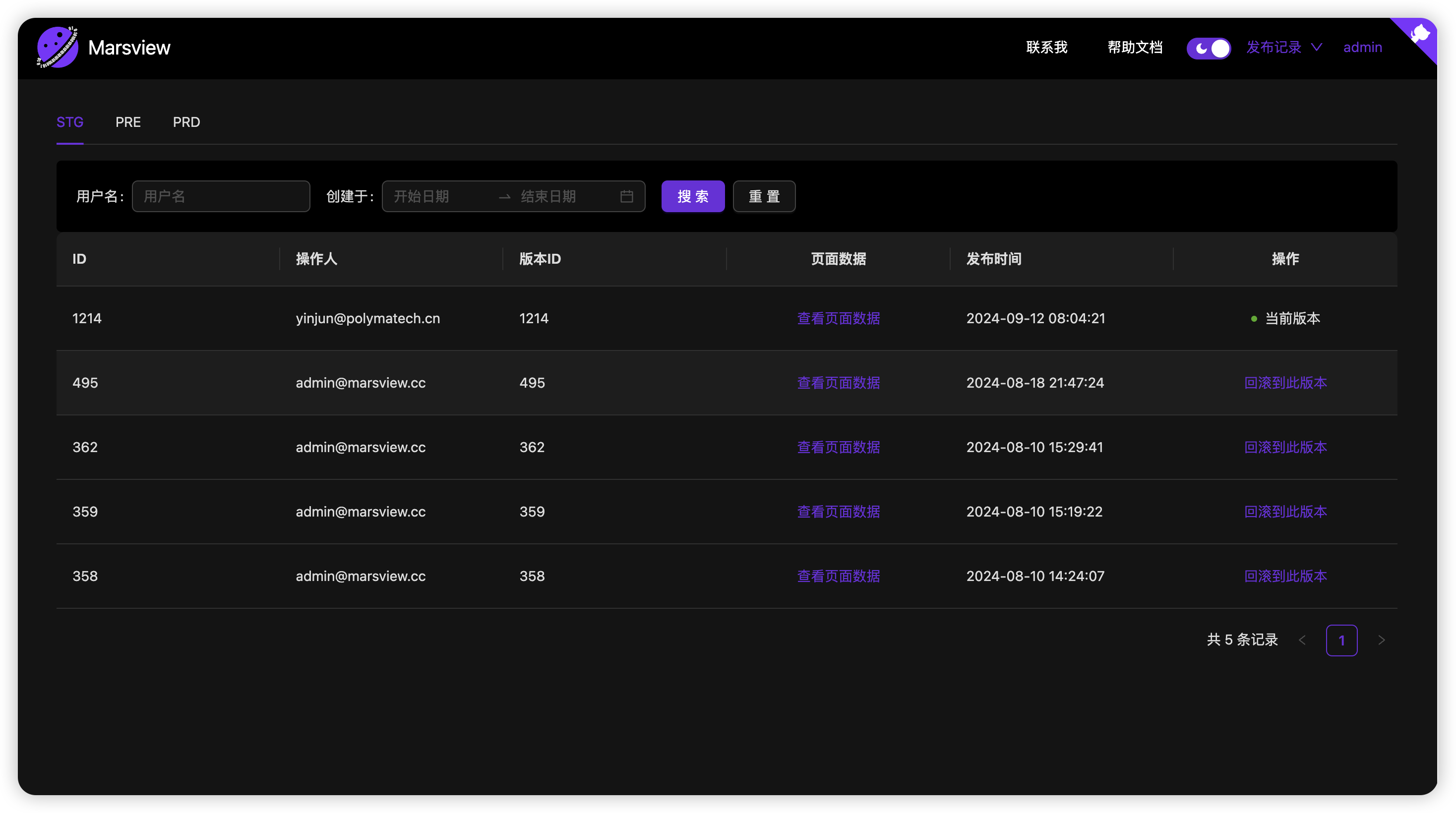 | 环境发布与回滚 | 支持 STG、PRE、PRD 三套环境,页面发布后可一键回滚。 |