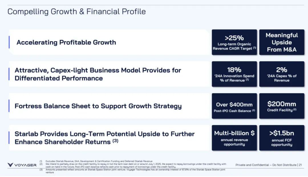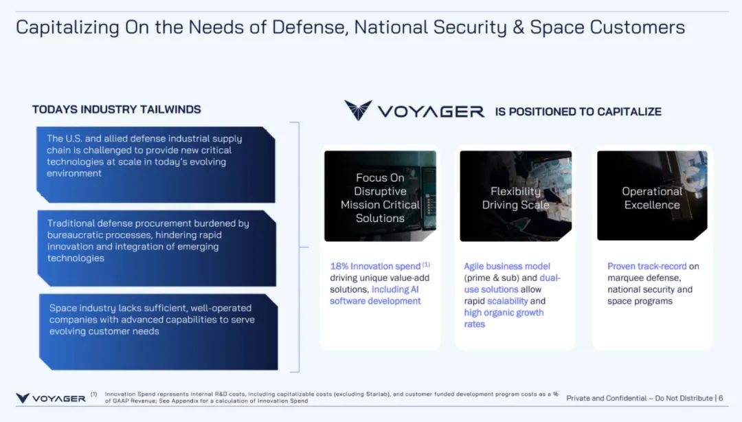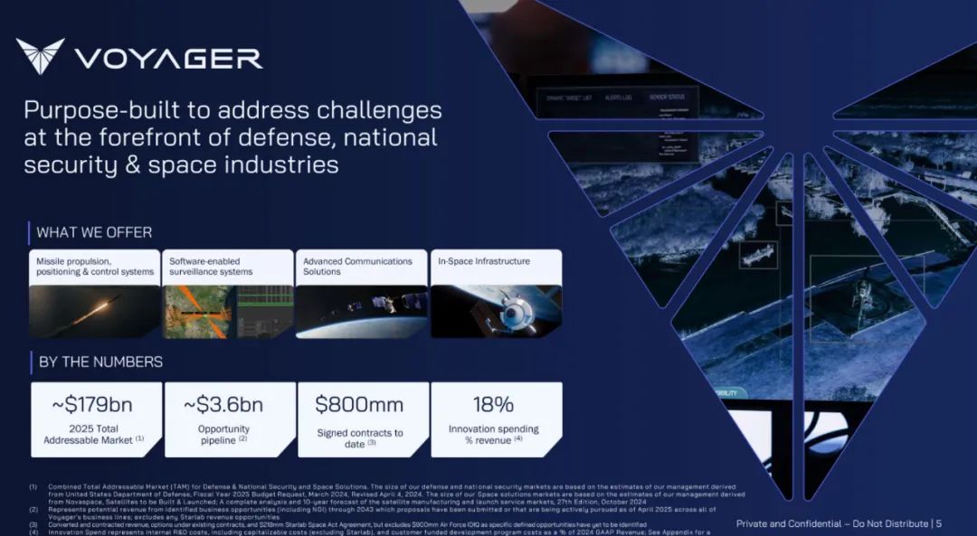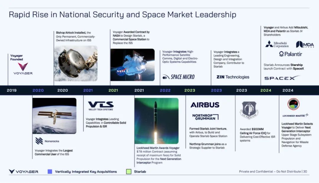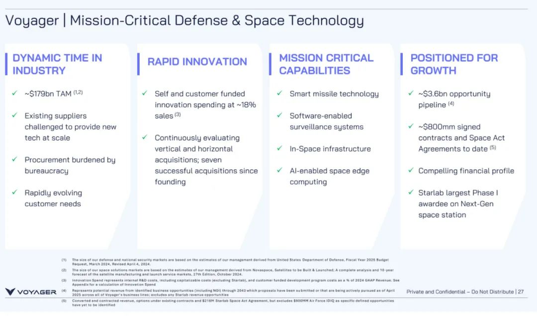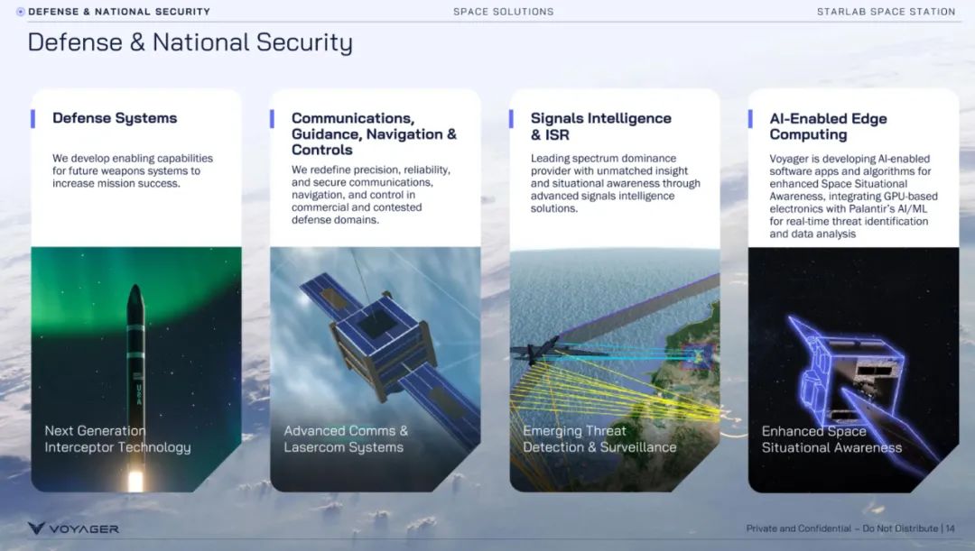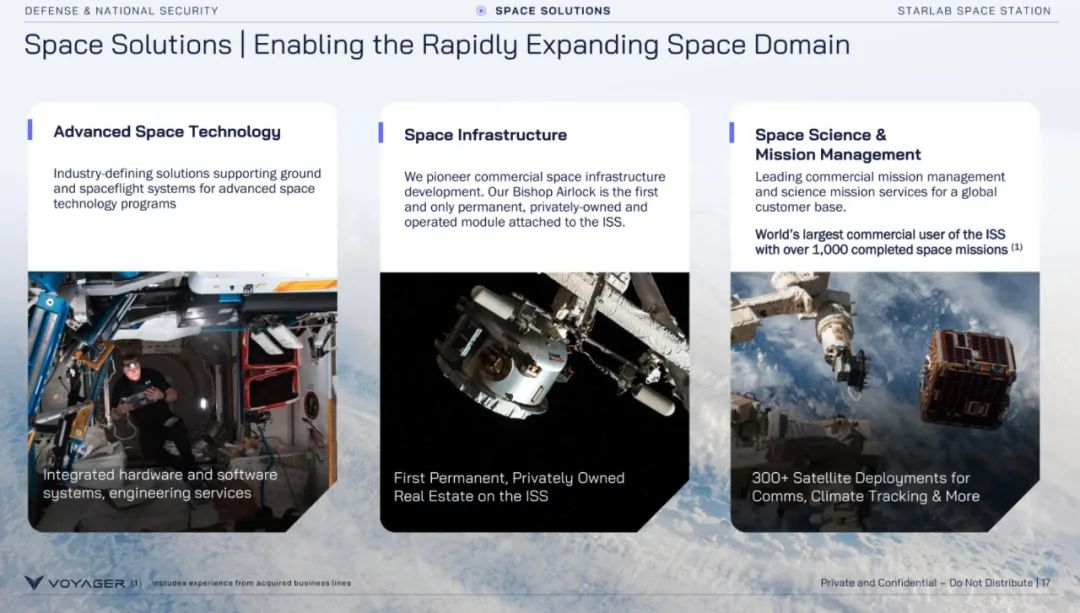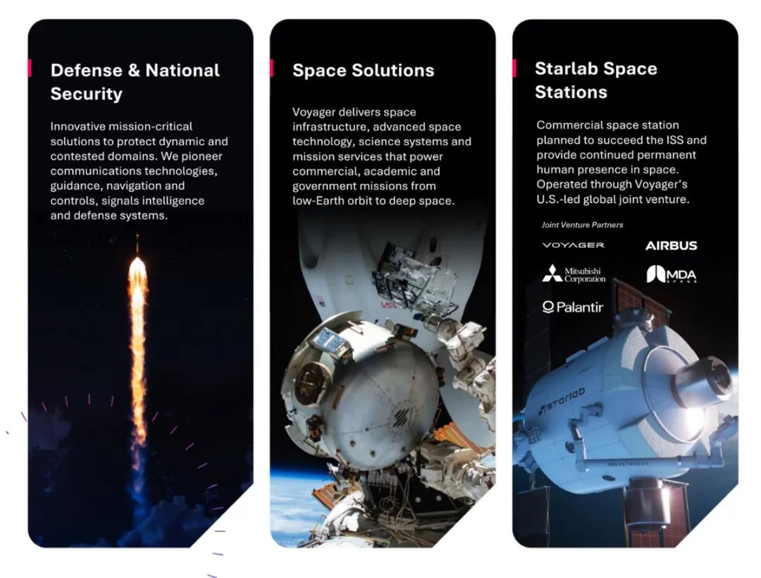 Voyager成立于2019年,是一家国防技术与太空解决方案公司,业务涵盖三大板块:国防与国家安全部门提供通信技术、制导导航与控制、信号情报及国防系统;太空解决方案部门提供空间基础设施、先进空间技术、科学系统及任务服务;Starlab空间站部门则计划打造接替国际空间站(ISS)的商业空间站。