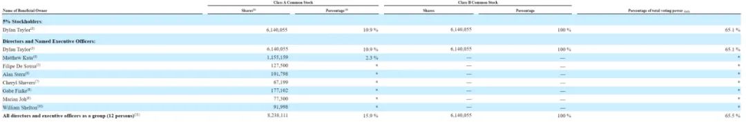 IPO前,Dylan Taylor持有10.9%的A类股,100%的B类股,有65.1%的投票权;Matthew Kuta持有2.3%的A类股。
