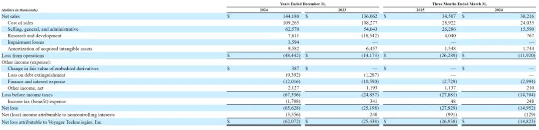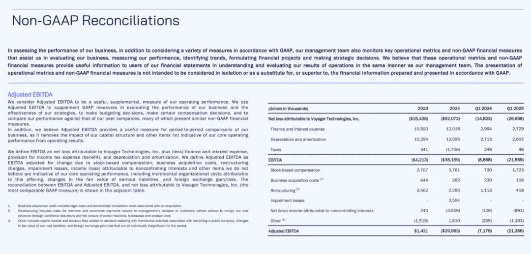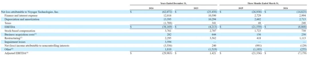 Voyager在2023年、2024年Adjusted EBITDA分别为142万美元、-2998万美元;Voyager在2025年第一季度Adjusted EBITDA为-2136万美元,上年同期为-718万美元。