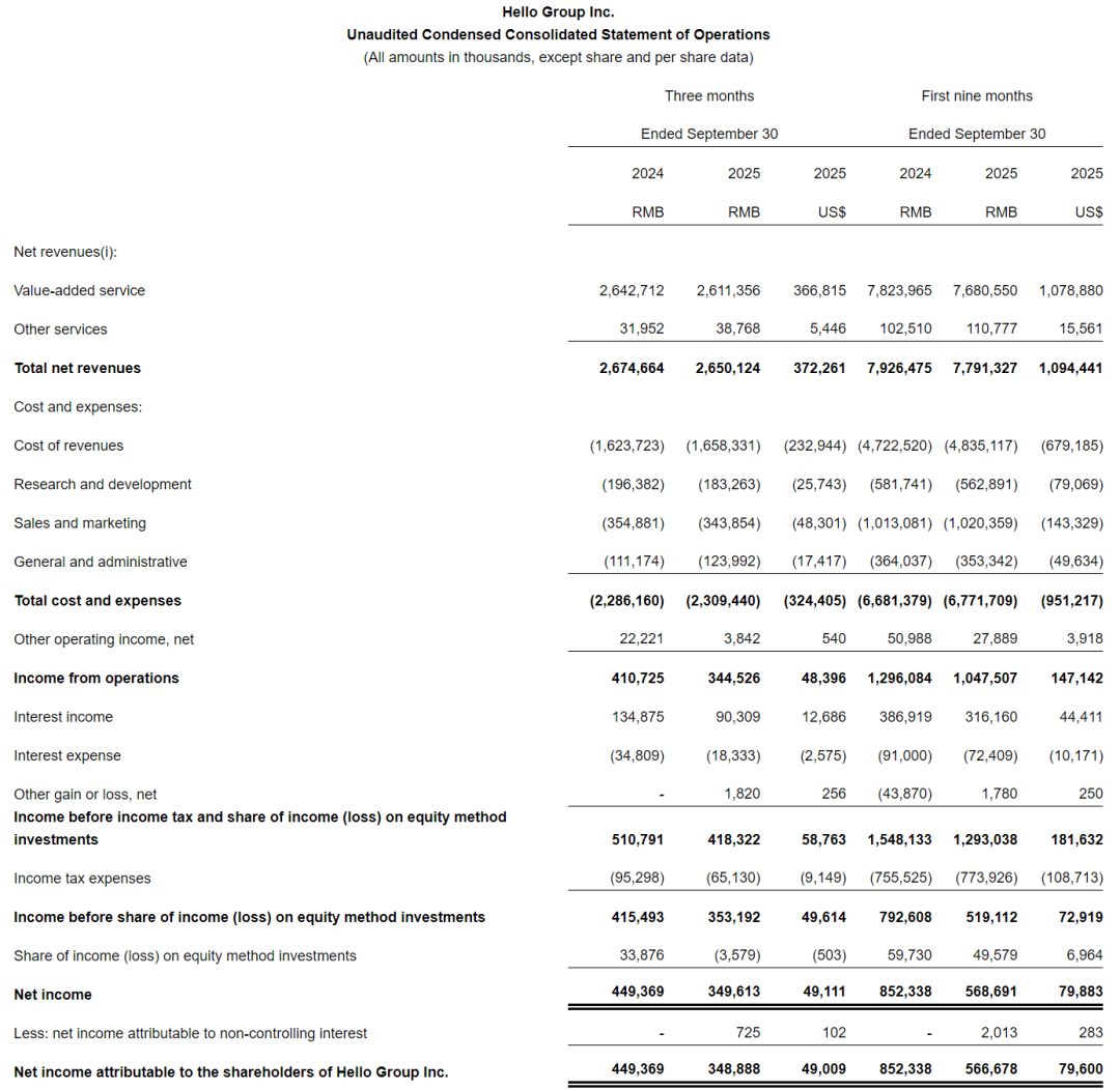 挚文集团增值服务收入主要包括来自各种音频、视频和文字场景的虚拟礼物收入及会员订阅收入。2025年第三季度增值服务总收入为26.114亿元(3.668亿美元),较2024年同期的26.427亿元下降1.2%。下降的主要原因是外部因素影响了部分主播和机构的运营重点,以及陌陌应用上消费者情绪疲软,其次,探探付费用户数量因用户基数下降而减少。