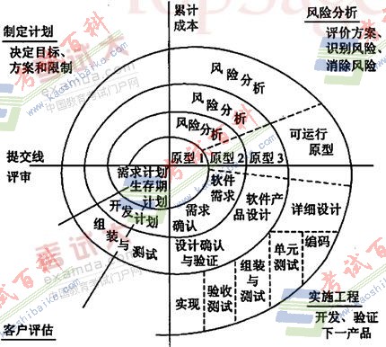 螺旋模型将瀑布和快速原型模型结合起来,强调了其他模型所忽视的风险分析,特别适用于大型复杂系统。螺旋模型的基本思想是,使用原型及其他方法来尽量降低风险。螺旋模型可理解为在每个阶段之前都增加了风险分析过程的快速原型模型。螺旋模型强调四个方面的活动:制定计划、风险分析。实施工程和客户评估。