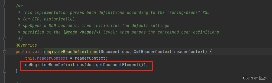 loadBeanDefinitions并不是这次关注的焦点,doLoadBeanDefinitions的细节也就不用深究了,重要的是在doLoadBeanDefinitions完成后,还只是得到了一个Document得对象,还不是我们要的bean定义信息,即BeanDefinition,所以继续进行了一个叫registerBeanDefinitions的步骤