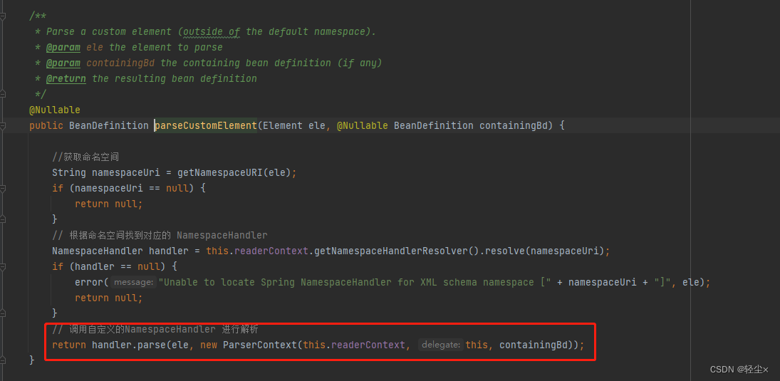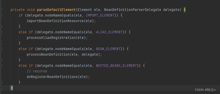 扯个题外话,什么是DefaultElement,这四个就是了,分别是import、alias、bean、beans,换句话说,除了这四个,其他的都是CustomElement