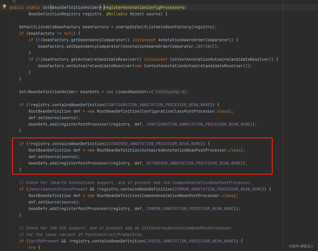 正是在这个方法内,把AutowiredAnnotationBeanPostProcessor的注册到了Set<BeanDefinitionHolder>中
