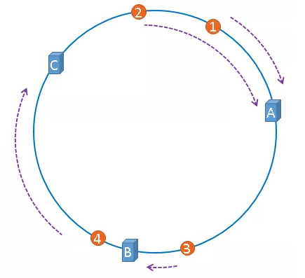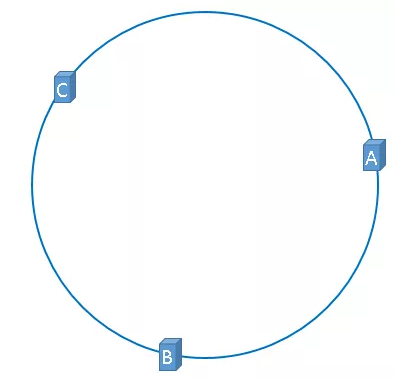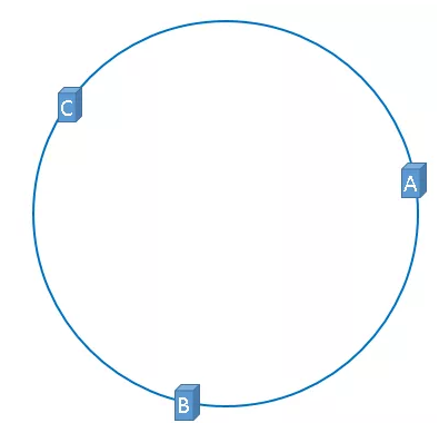 在介绍一致性哈希算法概念的时候,我们采用的是理想化的方式,假设3台服务器均匀的分布在哈希环上,如下图所示: