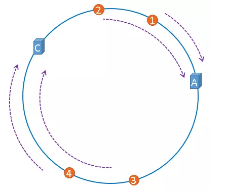 假设,服务器B宕机了,现在我们需要将服务器B退役,我们将上图中的服务器B从哈希环中移除,示意图如下