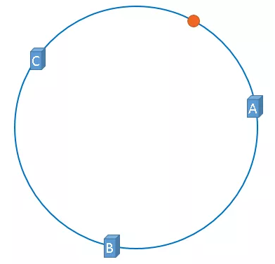 很好,现在服务器和图片都映射到哈希环了,那我们的图片该缓存到哪个服务器上呢?上述图片将会被缓存在服务器A,这是为什么呢?因为从这个图片的位置开始,顺时针往前移动,最先遇到的点是服务器A,因此这个图片将缓存在服务器A上,如下图所示: